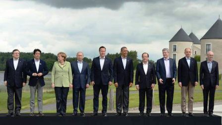 Zie ze daar toch staan, met van links naar rechts de naar eigen zeggen belangrijkste mensen van de wereld: Jose Manuel Barroso, Shinzo Abe, Angela Merkel, Vladimir Poetin, David Cameron, Barack Obama, Francois Hollande, Stephen Harper (Canada), Enrico Letta en – last but not least (sic) – Herman Van Rompuy.